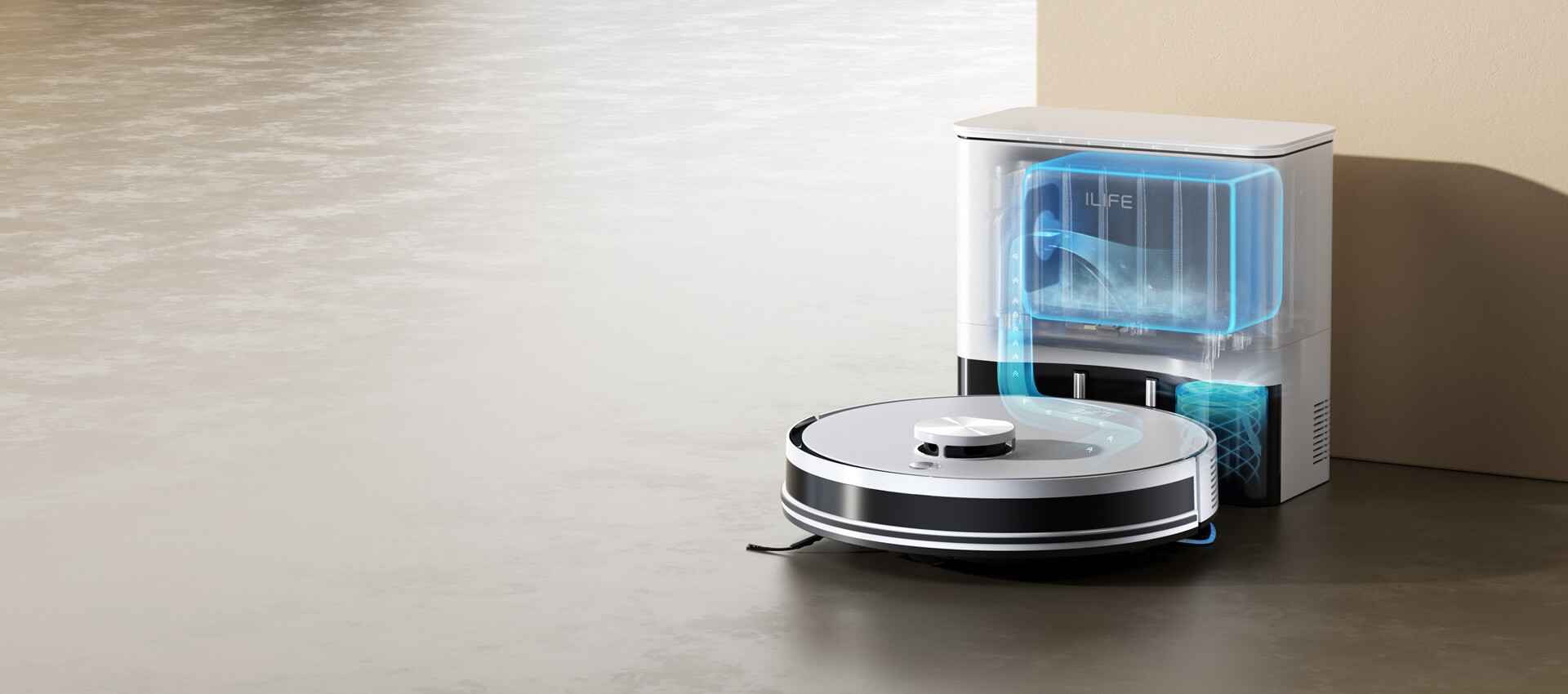Stacja z systemem cyklonowym 12 000 Pa automatycznie opróżnia pojemnik robota.