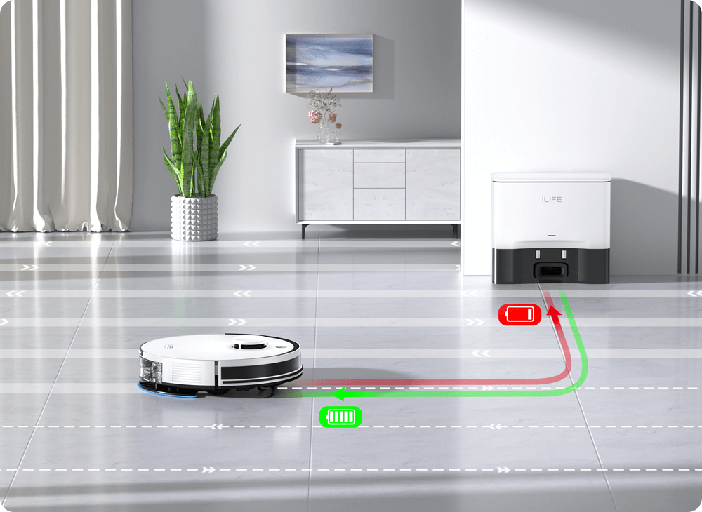 Robot wraca do stacji przy niskim poziomie baterii i wznawia czyszczenie po naładowaniu.