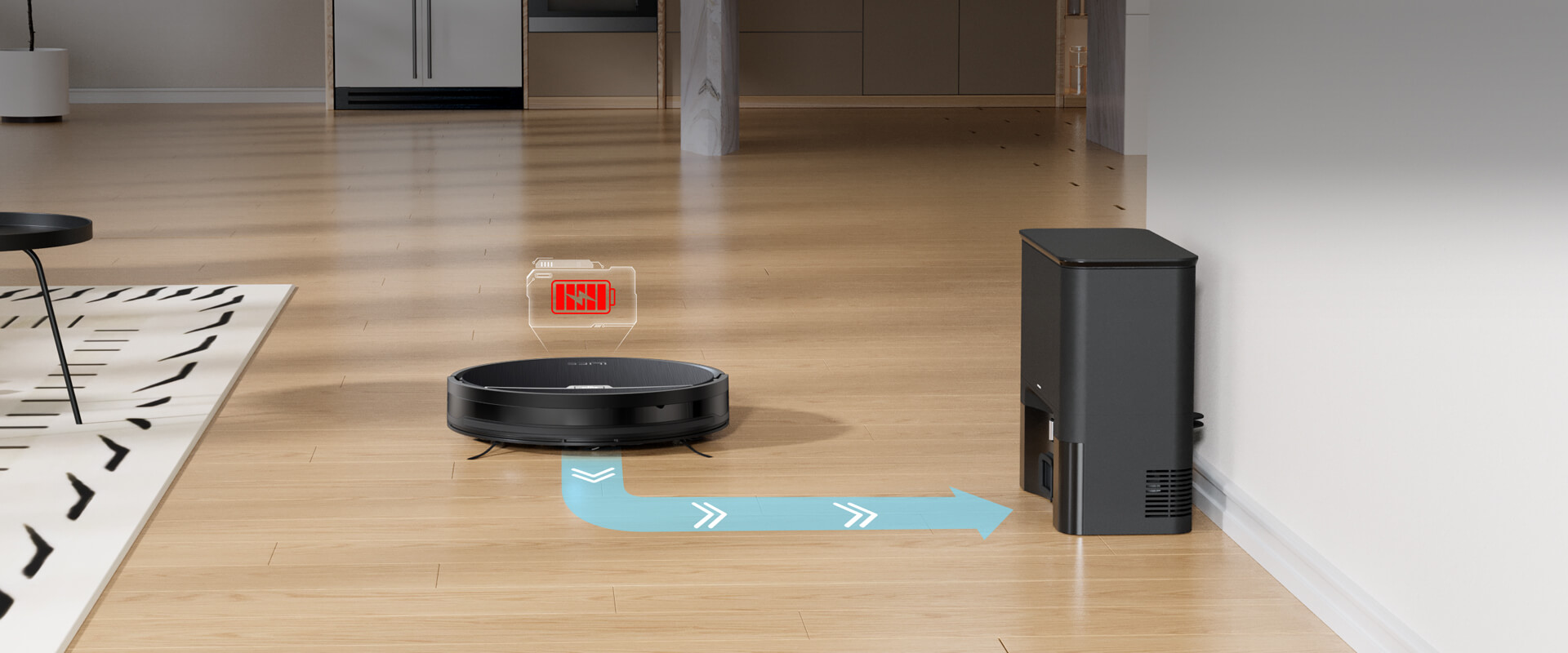 Automatycznie wraca do stacji samoopróżniającej, gdy bateria jest niska.