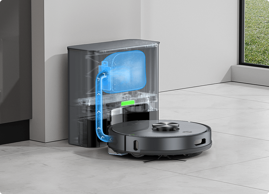 Stacja samooczyszczająca z potężnym zbieraniem kurzu cyklonem o sile 20 000Pa automatycznie czyści pojemnik na kurz robota w zaledwie 20 sekund, zapobiegając wszelkim zatorom.