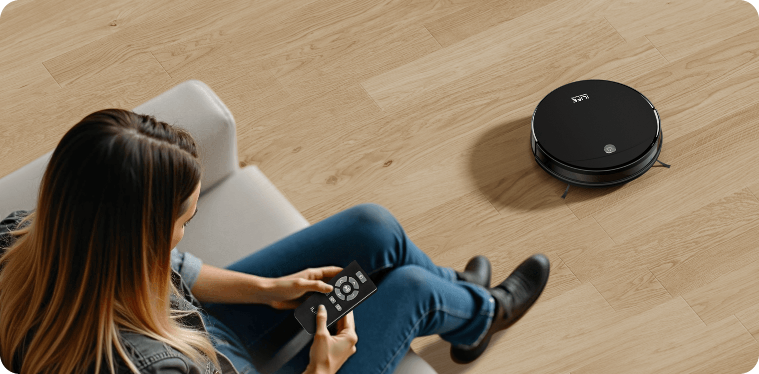 Rozpocznij sprzątanie jednym przyciskiem na robocie lub użyj pilota dla wygodnej kontroli.
