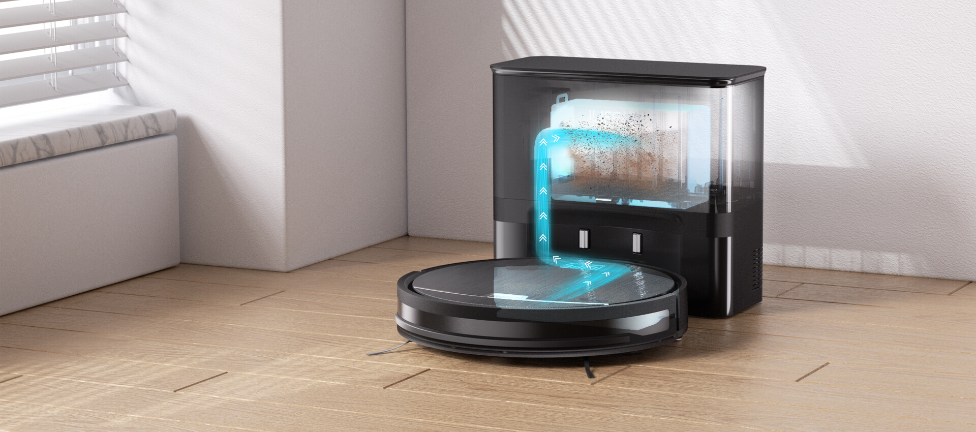 Stacja samoopróżniająca z potężnym systemem cyklonowym o mocy 12 000Pa automatycznie opróżnia pojemnik na kurz w robocie.